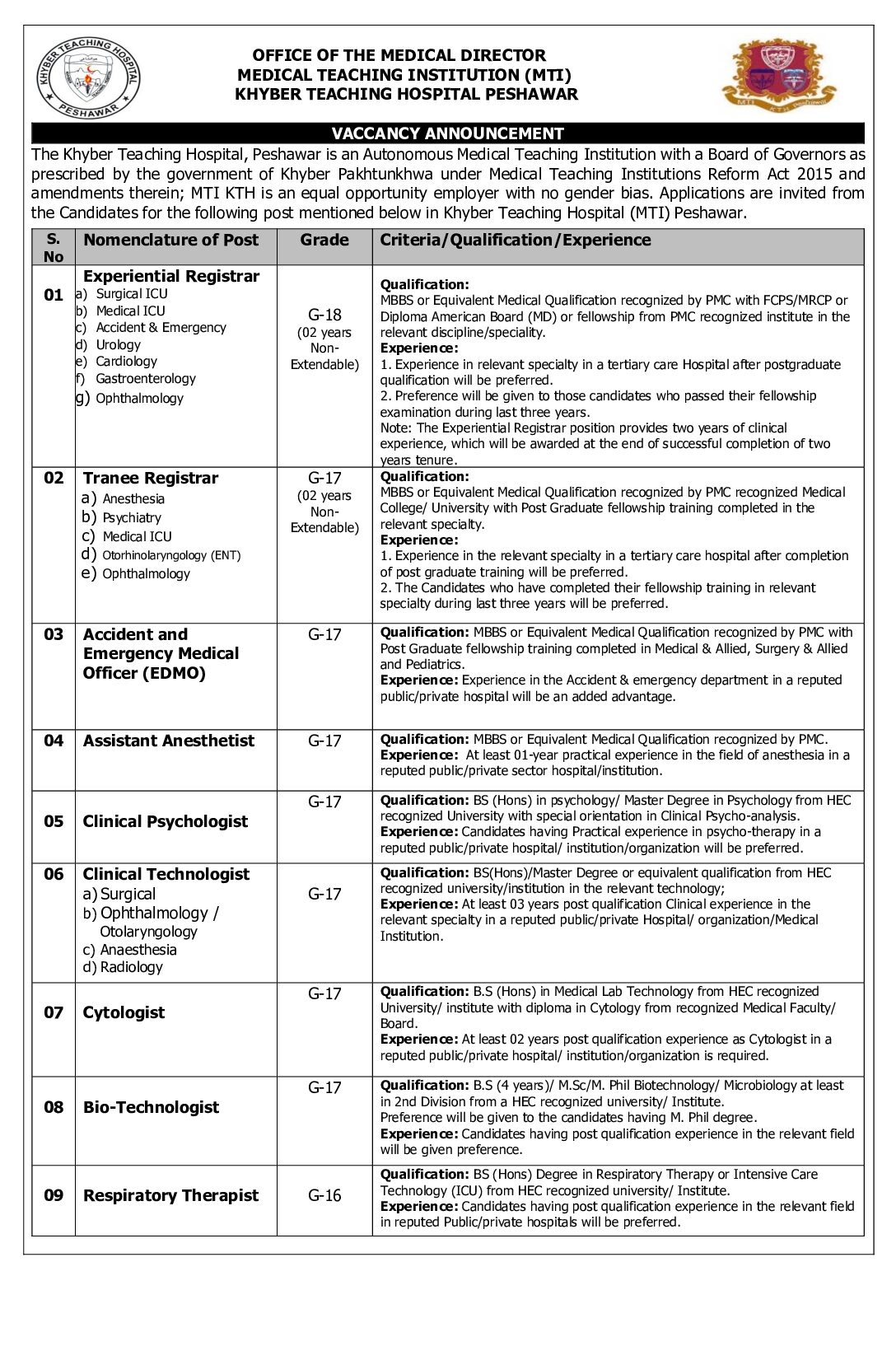 KTH Peshawar Jobs 2025 Latest Vacancies at Khyber Teaching Hospital